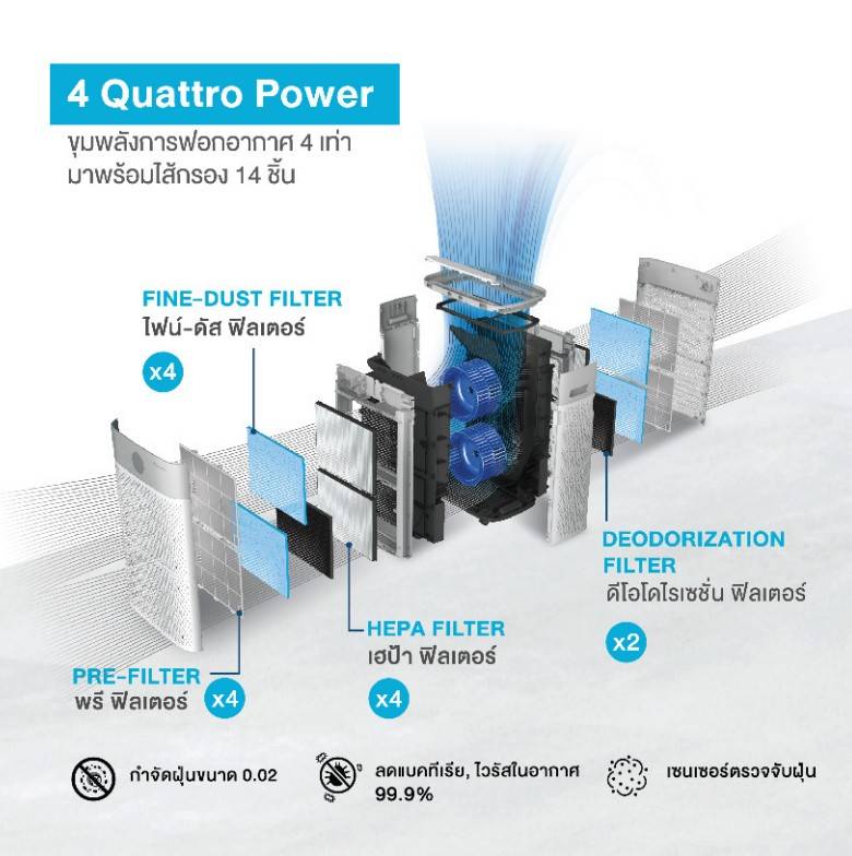 มอเตอร์คู่และพัดลมระบายอากาศ มาพร้อมไส้กรอง 14 ตัว เพื่อการทําความสะอาดที่ทรงพลัง จึงมั่นใจและเชื่อถือได้ นอกจากนี้ Coway ยังพัฒนาไดนามิกเทคโนโลยีทางอากาศ มอบทางเลือกที่สะอาด สําหรับบ้านและสภาพแวดล้อมของคุณ