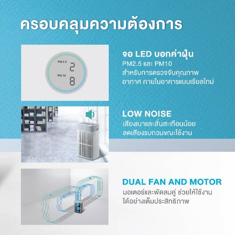 เครื่องฟอกอากาศที่มาพร้อมพลังการฟอกที่เพิ่มขึ้นถึง 4 เท่า มาพร้อมระบบดูดและมอเตอร์แบบคู่ สำหรับการทำความสะอาดที่ทรงพลัง ครอบคลุมทุกความต้องการ สะดวกสบาย อากาศสะอาดอย่างหมดจด