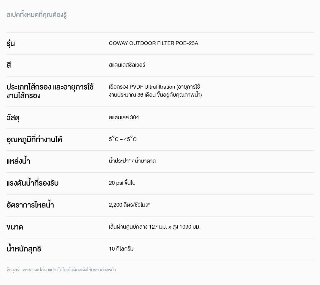 POE-23A Coway Outdoor Filter จุดเดียวครบ กรองจบรอบบ้าน กรองได้ 0.01 ไมครอน กรองสะอาดมั่นใจทุกหยด ด้วยระบบการกรอง PVDF ULTRAFILTRATION MEMBRANE High Quality 4-Way Valve วาล์วควบคุม 4 ทิศทาง กันน้ำระดับ IPX 5 ทนละอองน้ำ ใช้งานได้ทุกสภาพอากาศ